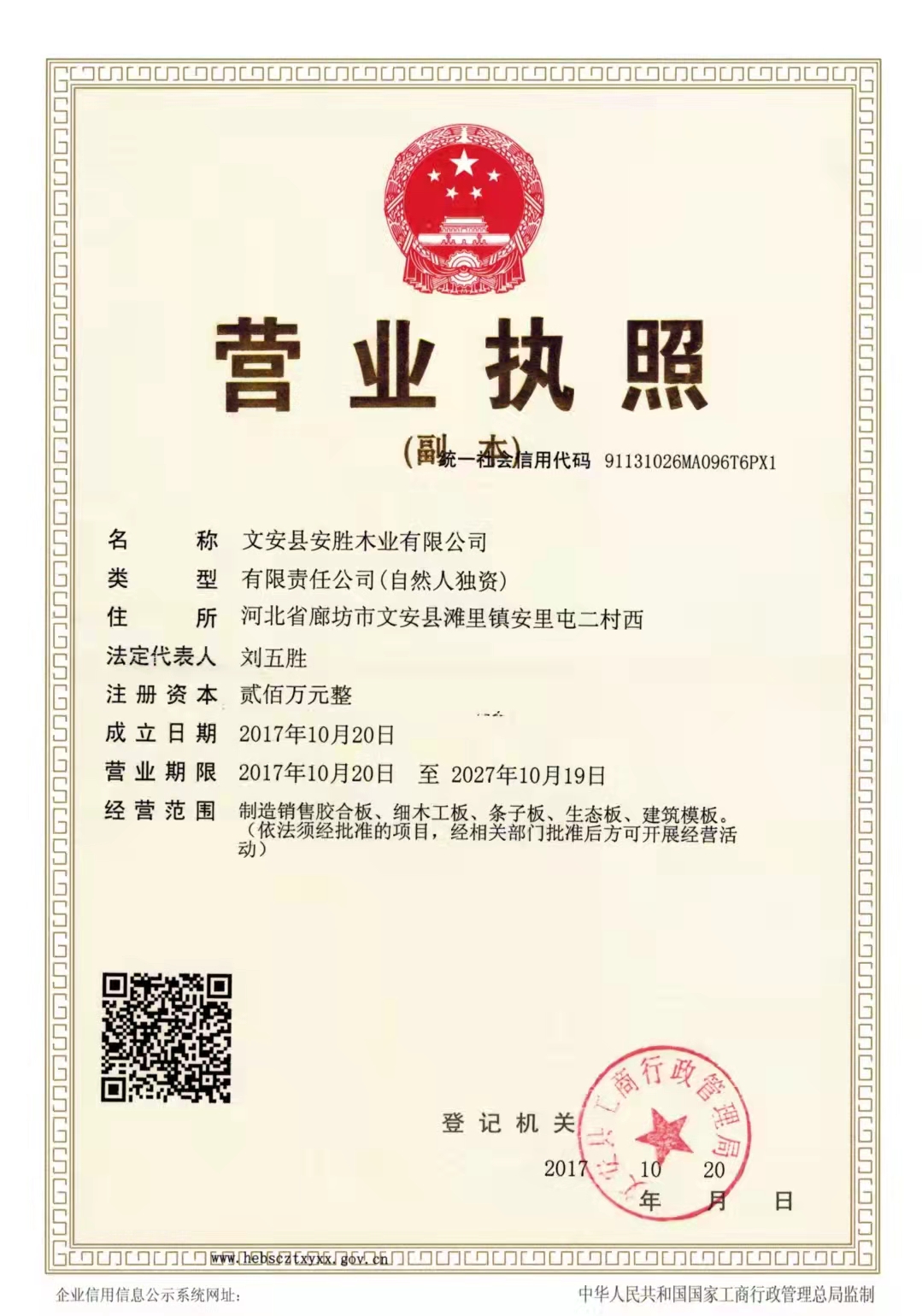 文安縣安勝木業有限公司位于膠合板基地文安縣安里屯。地處京津保三角地帶交通便利。經過十幾年的奮斗,我們集板材研發、生產、銷售于一體,其中注冊商標“皇家木坊”“吉爾加”“安勝至尊”。產品遠銷全國各地。